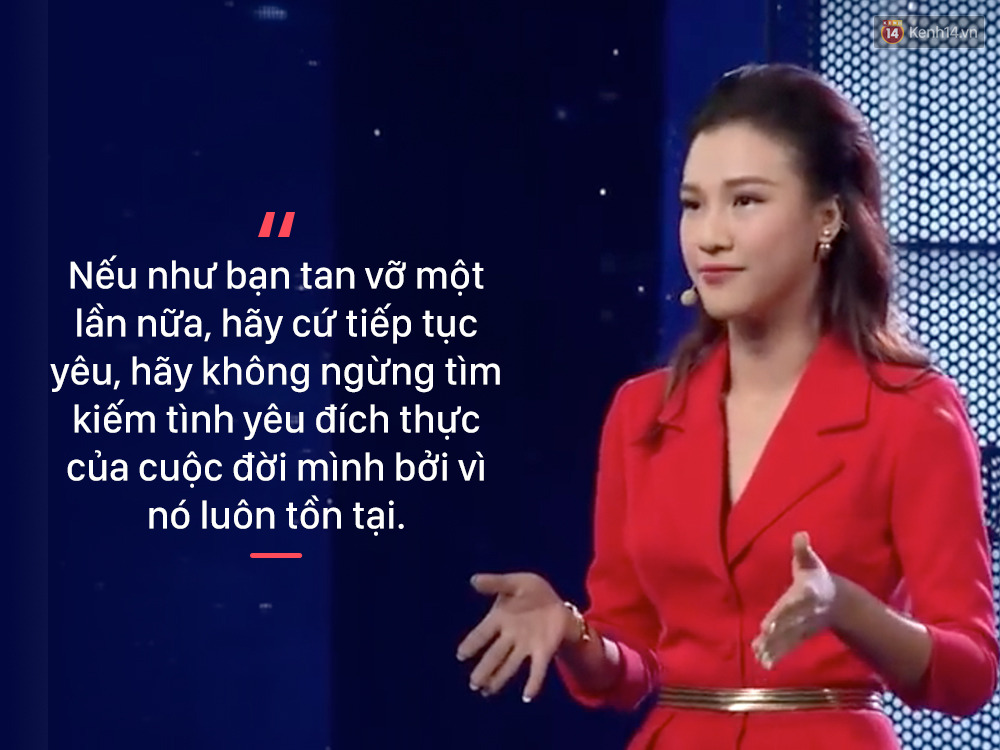 "Hãy chuẩn bị một trái tim thật khỏe mạnh, thật hạnh phúc và hãy tin vào bản thân mình trước, yêu bản thân mình trước để có thể rồi lại yêu và được yêu. Bạn có thể nói với tôi là ”Lỡ như mà chúng tôi tan vỡ một lần nữa thì sao?“. Bạn hãy biết rằng khi chúng ta tan vỡ, một - chúng ta yêu sai người, hai - chúng ta yêu sai cách. Hãy học lại cách yêu. Nếu như bạn tan vỡ một lần nữa, hãy cứ tiếp tục yêu, hãy không ngừng tìm kiếm tình yêu đích thực của cuộc đời mình bởi vì nó luôn tồn tại”.